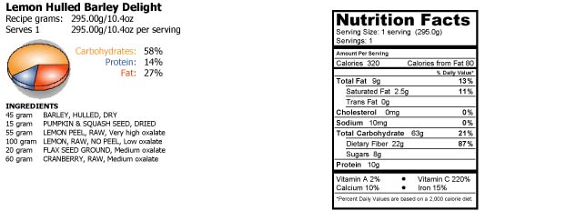 This morning, for example, a hearty, nutrient-dense, low-GI breakfast featured hulled barley (flavored with juniper berries, ginger and tarragon), topped with a fresh, organic lemon cut into petite slices, cranberries, and pumpkin seeds and sprinkled with ground flax seed and a little lemon juice for moisture.