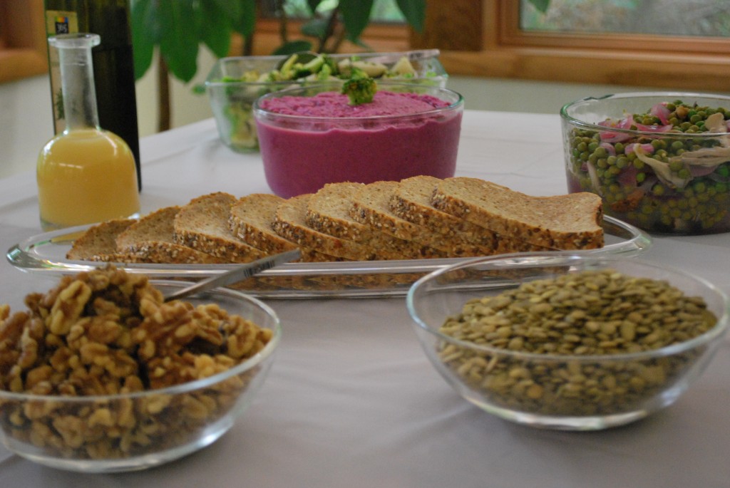 Pictured here are 1) a garden pea entrée, seasoned with rosemary combined with savory portabella and maitake mushrooms – nothing like boosting your immune system, which these amazing foods are known to do: they are also high in vitamin D; 2) pumpkin seeds, walnuts, lemon juice, and olive oil; 3) the lemon-flavored (lemon-juice-marinated) sprouted grain bread in the center is ready to be adorned with 3) a colorful tarragon cabbage spread loaded with phytochemicals and high in strontium and boron; 4) the vegetable salad in the back combines garlic, broccoli, and black radishes (high, high, high in phytochemicals).